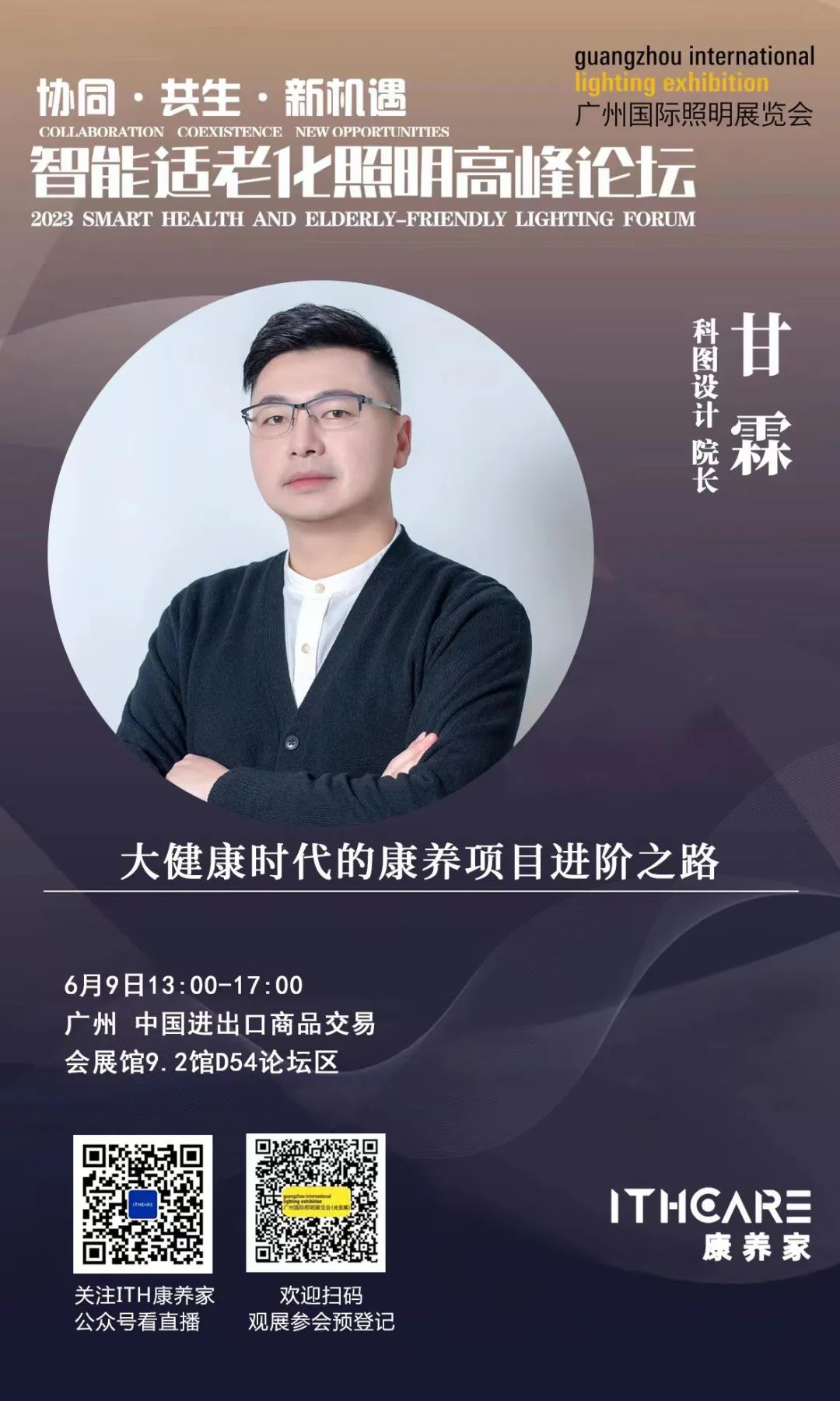 6月9日,科圖設(shè)計(jì)再次受廣州國(guó)際照明展覽會(huì)及智慧康養(yǎng)專(zhuān)業(yè)新媒體平臺(tái)ITH康養(yǎng)家的盛情邀請(qǐng),由甘霖院長(zhǎng)為大家?guī)?lái)康養(yǎng)設(shè)計(jì)領(lǐng)域課題《大健康時(shí)代康養(yǎng)項(xiàng)目進(jìn)階之路》的分享。