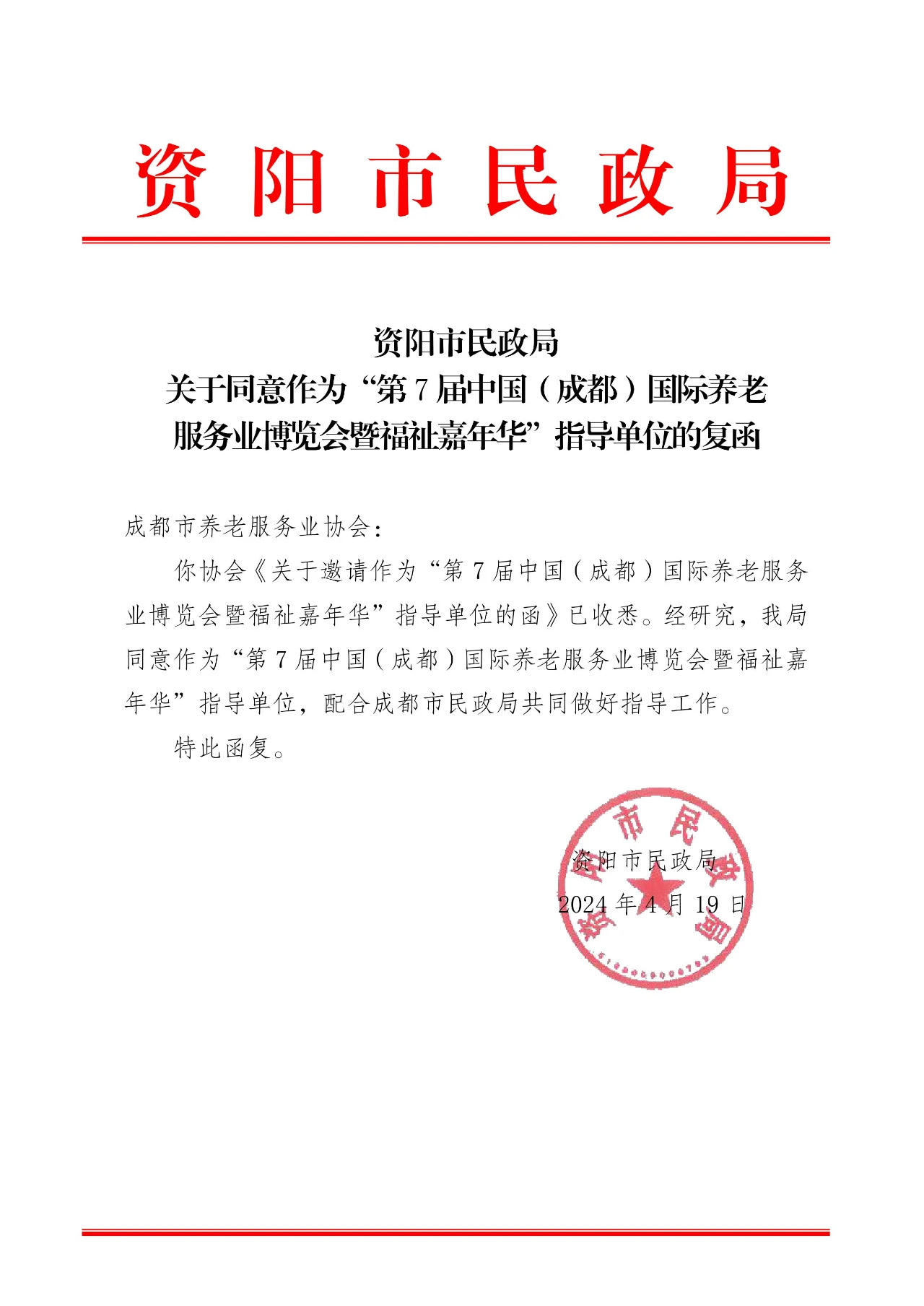 成都市民政局、成都市醫(yī)療保障局、德陽市民政局、眉山市民政局、資陽市民政局、中共成都市委老干部局復(fù)函同意作為“第7屆中國(成都)國際養(yǎng)老服務(wù)業(yè)博覽會暨福祉嘉年華”(以下簡稱“第7屆成都老博會”)指導(dǎo)單位,附復(fù)函內(nèi)容。