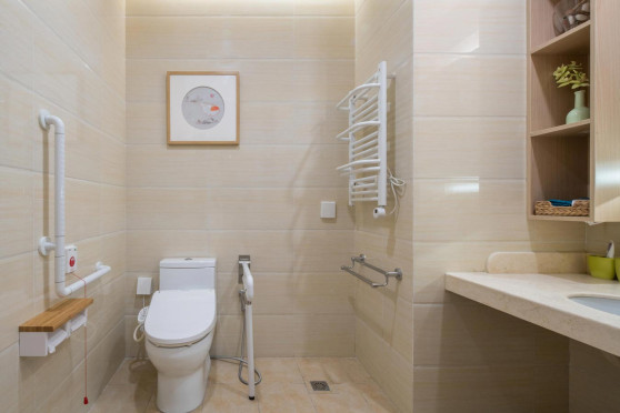 衛(wèi)生間是老人在室內(nèi)最容易發(fā)生危險事故的場所,因此在設(shè)計時是需要重點考量的細節(jié)之一,安全、方便性即是量化標準。衛(wèi)生間一般分為洗浴區(qū)、如廁區(qū)、盥洗區(qū)、更衣區(qū)等四大主要功能區(qū),根據(jù)情況設(shè)置家務(wù)區(qū)等輔助功能區(qū)。