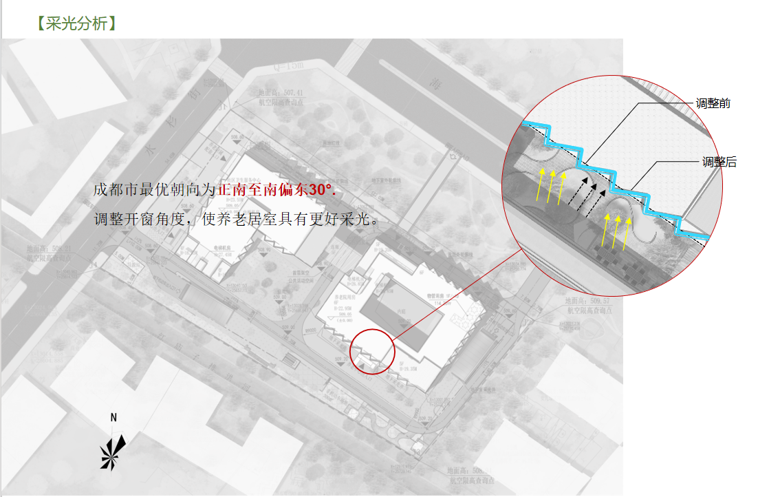 成都市最優(yōu)朝向?yàn)檎现聊掀珫|30°,于是建筑設(shè)計(jì)師將開窗角度調(diào)整,使養(yǎng)老居室具有更好采光。