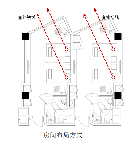 由建筑斜窗的設(shè)計(jì),推導(dǎo)出房間布局:護(hù)理室為同位布局方式,每個(gè)護(hù)理室室外視線的舒適度一致,方便護(hù)理人員同位操作。